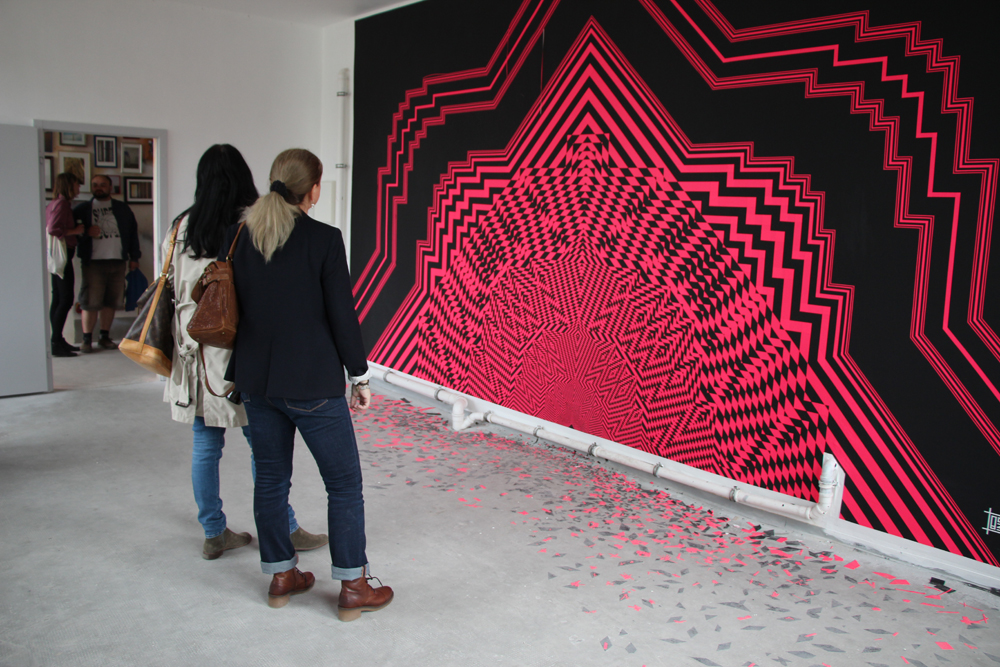 Frank Tangermann kommt aus Halberstadt und arbeitet seit 8 Jahren in Leipzig. Klare geometrische Figuren schaffen eine Illusion von Raum. In sich harmonisch ausgerichtet wird das Herausstrebende wieder eingefangen. Dabei kommt es zum Ausloten der Kraft von Farbkontrasten, mit denen wir Moderne assoziieren. Geometrische Konstruktionen, die ein Hervor- und Zurücktreten untersuchen, zeugen von konzentrierter Aufmerksamkeit. Seriell angelegt verweisen seine Arbeitemn auf optische Wahrnehmungsphänomene. Das Heraustreten aus der Fläche passiert in unseren Köpfen.